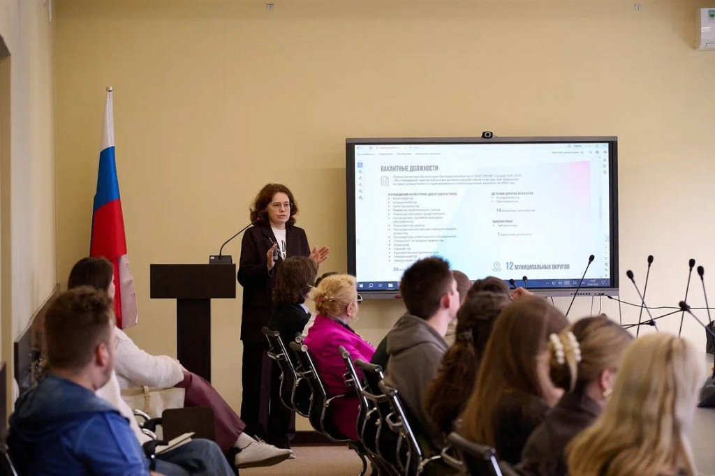 Ольга Михайловна Хорошавина в своем выступлении отметила, что в Ярославской области есть 26 вакансий в учреждениях культурно-досугового типа, 18 вакансий в детских школах искусств и 1 вакансия в области библиотечно-информационной деятельности. А также указала на возможности карьеры, которые открываются перед выпускниками благодаря данной программе, обозначив потенциальные проблемы, с которыми могут встретиться будущие работники культуры в регионе.